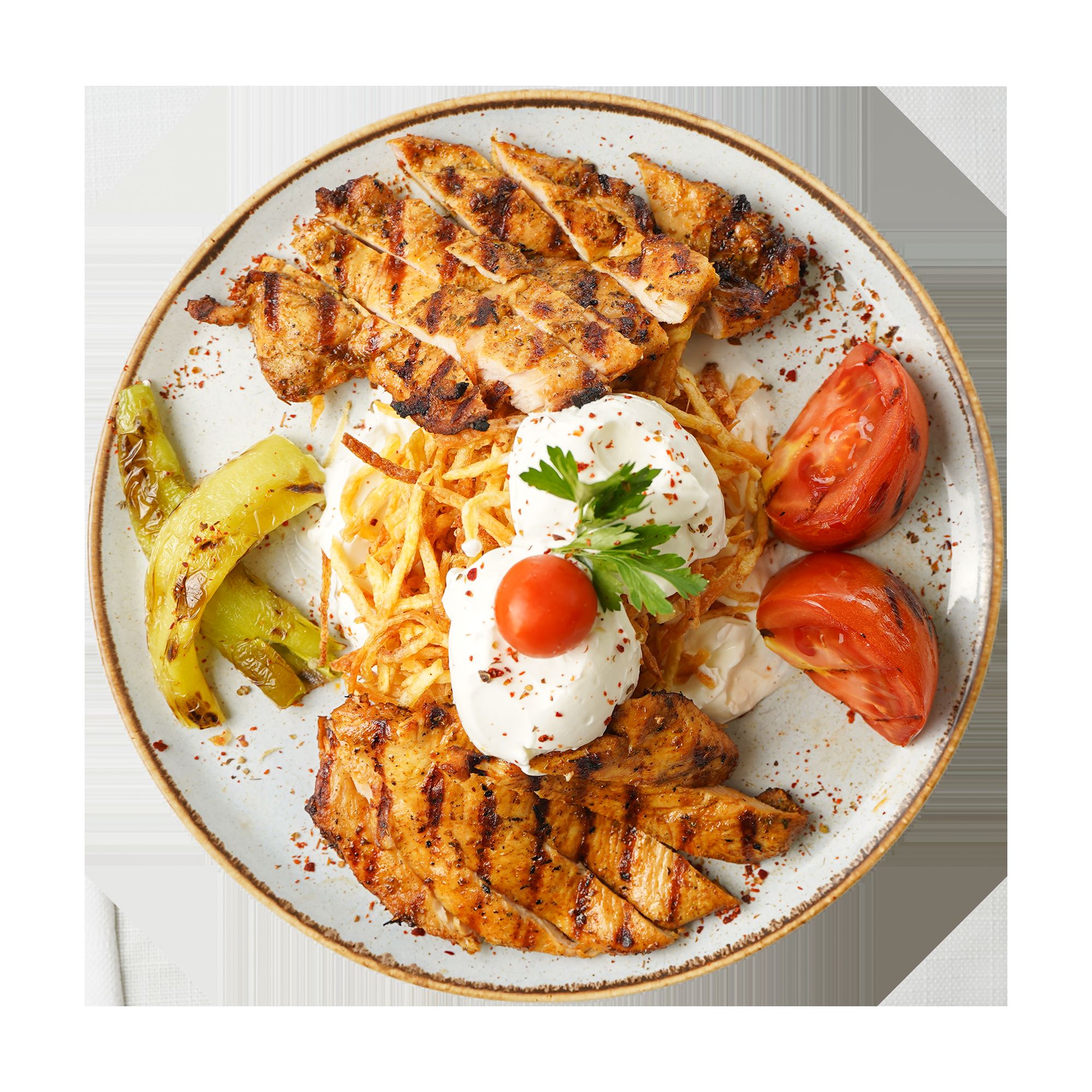SÜZME YOĞURT,KİBRİT PATATES, IZGARA PİLİÇ DİLİMLERİ.