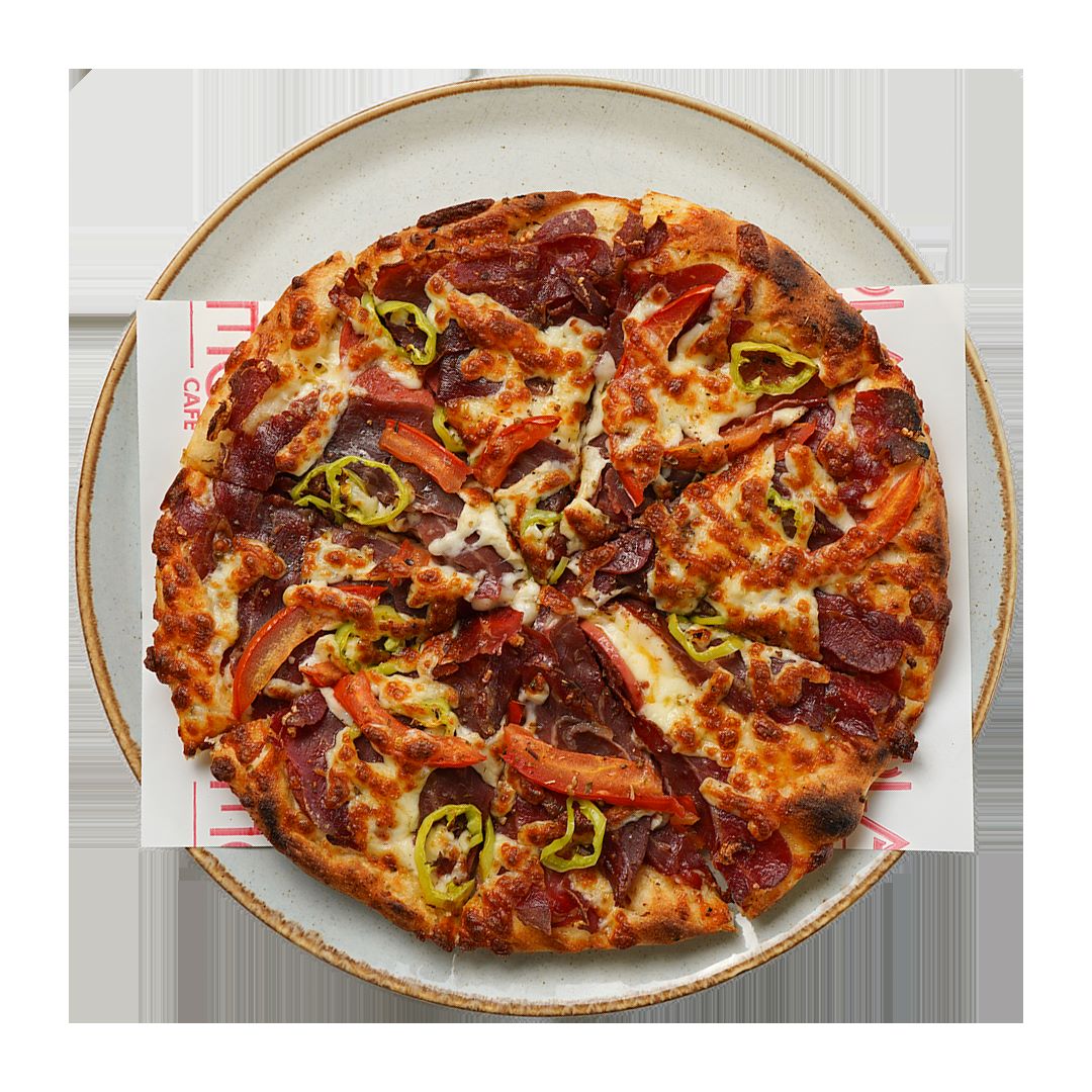 ÖZEL EL YAPIMI PİZZA HAMURU,MOZZARELLA PEYNİRİ,PASTIRMA,SUCUK,DOMATES VE BİBER.